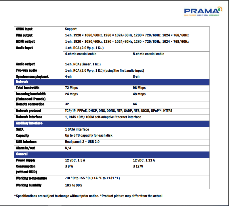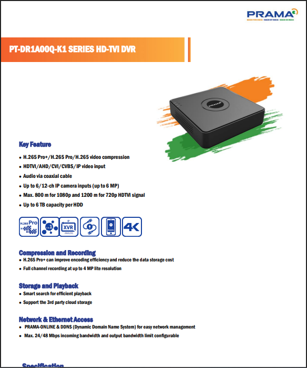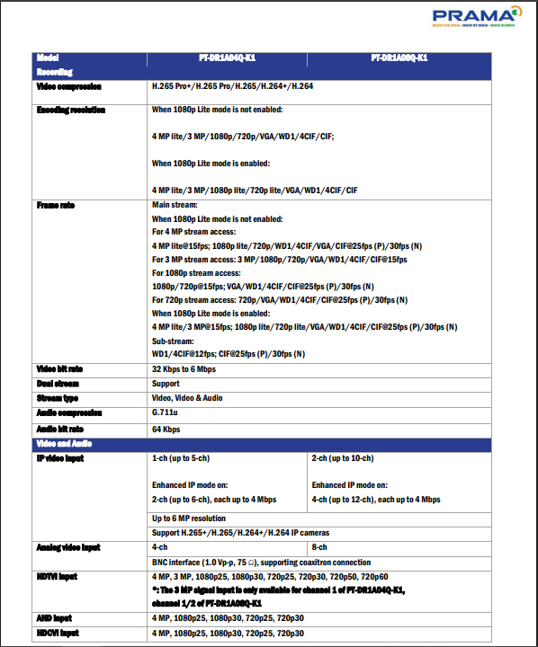 The PRAMA 2MP 4 Channel DVR, model PT-DR1A04Q-K1, is a compact and durable metal body digital video recorder designed for small surveillance setups. It supports up to 4 analog HD cameras with 2MP resolution, ensuring sharp video recording and smooth playback.