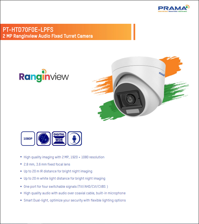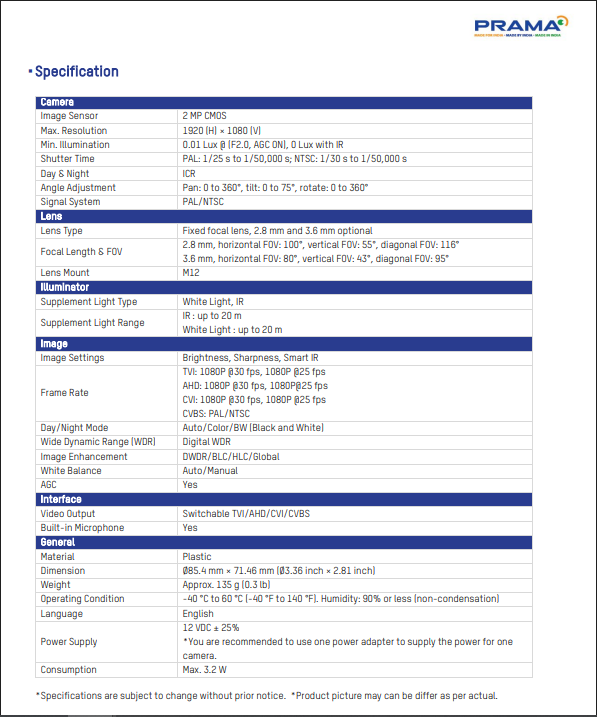 - Image Quality: 2 MP CMOS sensor, Full HD resolution (1920×1080, Minimum illumination of 0.01 Lux (F2.0, AGC on); total darkness coverage using IR