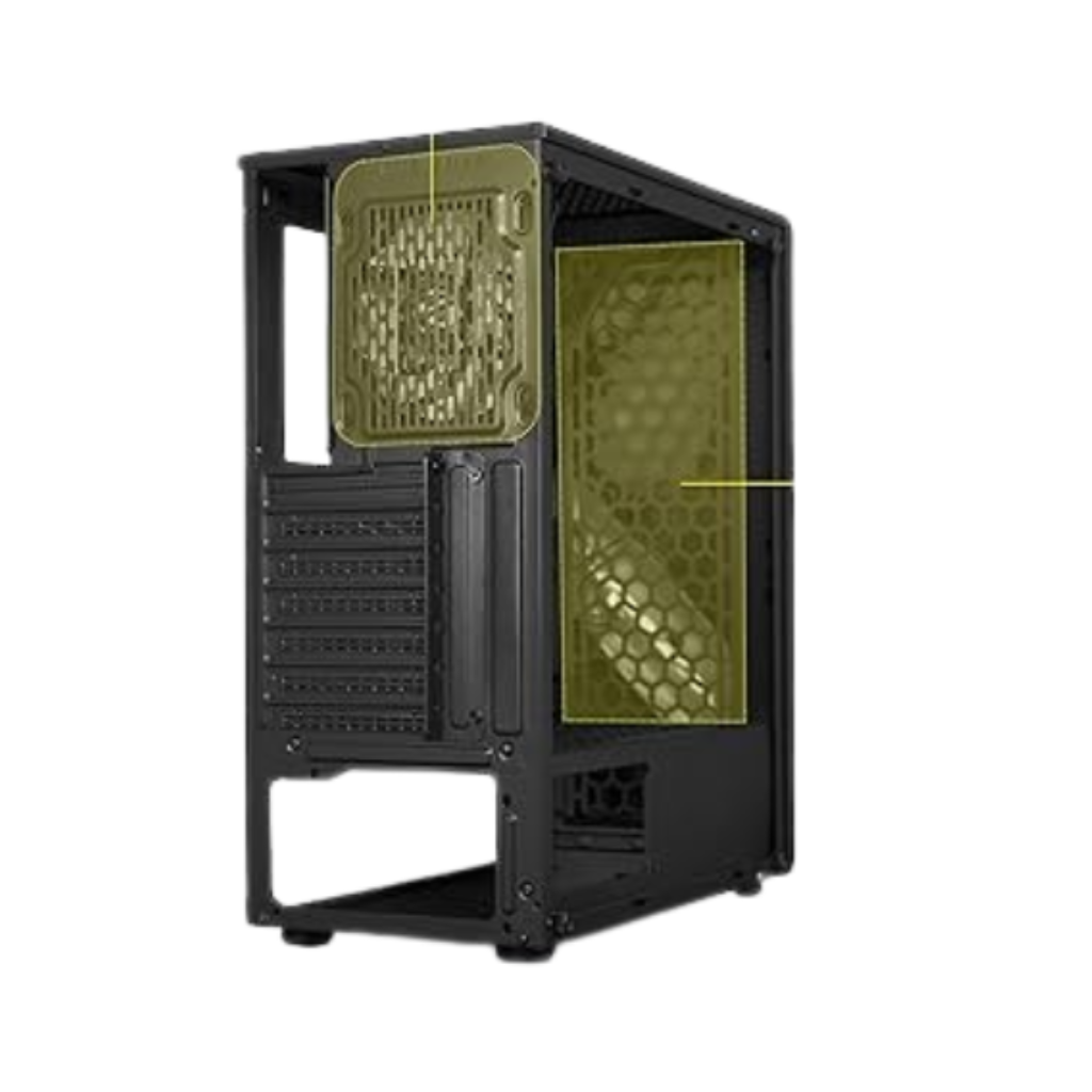 - One 120mm inner glow RGB LED cooling fan is incorporated into the chassis for adequate chassis cooling. External cooling fans can be fitted -two at the top and 3 at the front.