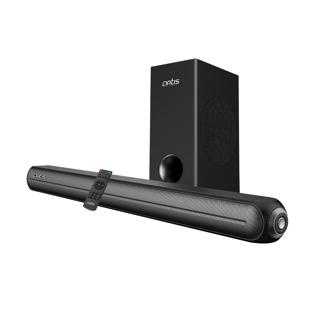 The Artis SoundHub 310 Wireless Bluetooth Soundbar delivers powerful audio with its 2.1 CH 200 watt output and a deep, rich sound experience using a wired subwoofer. With multiple input modes, it offers versatile connectivity for TVs, music systems, and more. It supports multiple input modes such as AUX, USB, HDMI (ARC) and Optical, which provides you a versatile connection for all devices. This soundbar combines strong performance, seamless wireless streaming, and enhanced bass for an immersive home entertainment setup.
