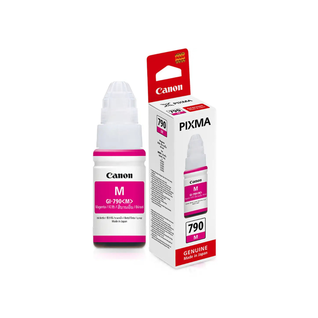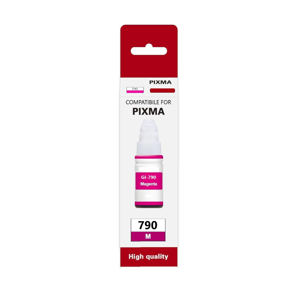 The Canon 790 Magenta Ink bottle contains bright, dark red and pink, which is suitable for sharp, eye catching print quality.Enjoy the rich, lively print with the cannon 790 magenta ink bottle, which provides upput up to 5 pages. Specifically designed for the Canon G1000, Canon G2000 and Canon G3000 printers, this original Canon ink ensures bright magenta tones, sharp details and chronic, faded resistant results. Suitable for pictures, creative designs and professional documents, Cannon 790 Magenta Ink bottle contains a spill resistant, easily usable refill system for smooth and reliable printer functioning.