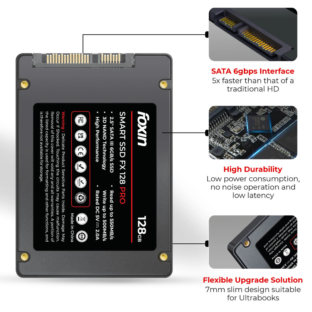 Equipped with SATA interface, Foxin 128GB SSD ensures simple installation and extensive consistency with most devices. Made with sustainable technology, it provides shock prevention, low electricity consumption and chronic performance, which makes it an excellent upgrade from traditional HDD.
