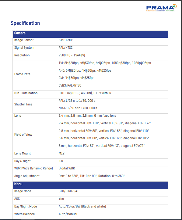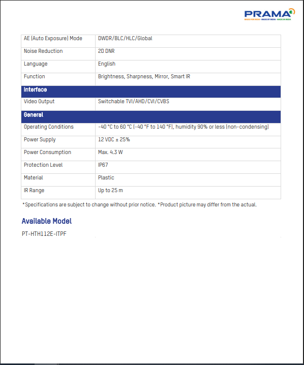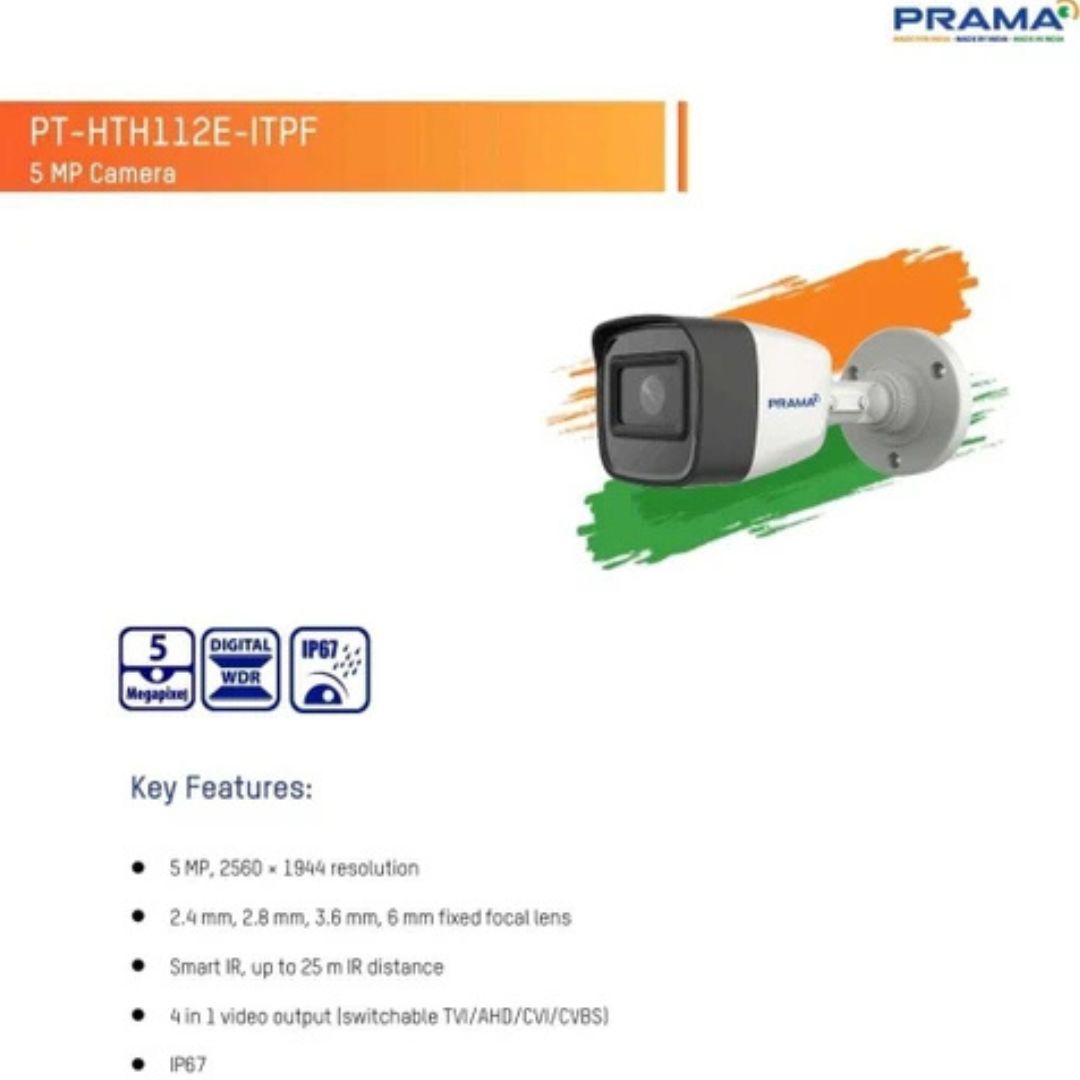 Prama 5MP HD Bullet Analog Camera Model PT-HTH112E-ITPF, A high definition surveillance camera that is designed to monitor clear and reliable security. This 5MP HD bullet analog camera compact 20 meter EXIR 4-in-1 camera supports multiple video formats (TVI/AHD/CVI/CVBS), which makes it compatible with a wide range of DVRs.