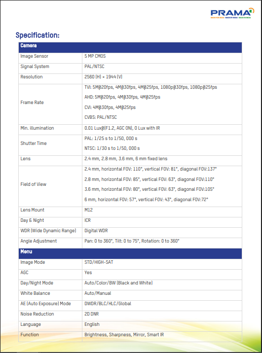 Prama 5 MP HD Dome Analog Camera, 2560×1944 resolution, 4 mm, 2.8 mm, 3.6 mm, 6 mm fixed focal lens, Smart IR, up to 20 m IR distance, 4 in 1 video output (switchable TVI/AHD/CVI/CVBS), Smart IR (EXIR) enables night vision up to 20 m, with automatic infrared adjustment for clear low light footage.